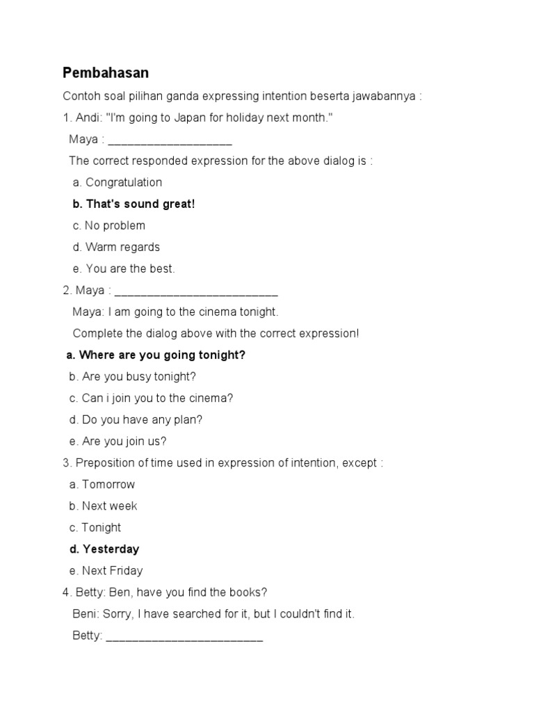 You want to go somewhere to enjoy the weekend. Contoh soal pilihan ganda expressing intention beserta jawabannya a e brainly co id. Berikut informasi sepenuhnya tentang contoh soal dan jawaban expressing intention. Contoh soal essay expressing intention kumpulan soal pelajaran 3. 10 soal pilihan ganda bahasa inggris untuk smp kelas 7 part ii beserta jawaban salah satu cara menguasai bahasa inggris yaitu dengan. Contoh ungkapan dan dialog percakapan expression intention dalam bahasa inggris. Then, answer the questions following that. Contoh soal bahasa inggris kelas 10 tentang intention. I am going to …. Take turns with your classmates doing the roles. Contoh soal essay expressing intention kumpulan soal pelajaran 3. Contoh soal bahasa inggris kelas x sma materi expressing intention. By om min posted on may 10 2016.